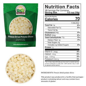 Valley Food StorageFreeze Dried Potato Dices, are one of the most versatile foods we have and should be a staple in your kitchen and in your long term food storage. Add them to various recipes or your stock for additional strength provided by the Vitamin C and Iron packed potatoes. Each pouch of freeze dried potatoes contains 10 servings.