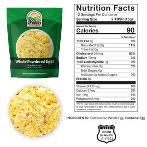 Valley Food StorageWhole Powdered Eggs are the best way to start the day with a hot breakfast, making it perfect for a quick and convenient breakfast or lunch for the whole family. Each pouch of whole powdered eggs contains 12 servings.